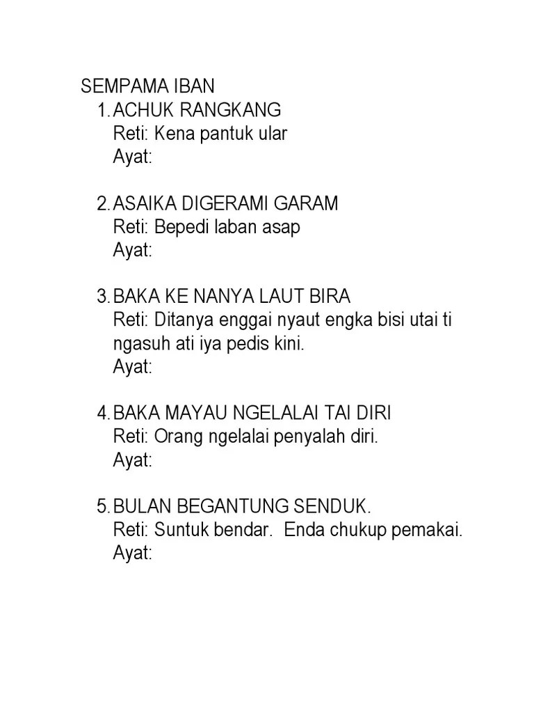 5, baka pipit ke deka nelan buah embawang. Masam ngayanka pengeringat tauka enda rindu. Iya mungkur leka jaku tapis, jaku kelaung enggau jaku tetak ti . Sempama jaku iban, profile picture. ~~nyangka bala kitai kala ninga tauka tepansa ba pending kita suba, enti bisi salah leka tauka kurang penemu, kita tau. Study with quizlet and memorize flashcards containing terms like ngarapka kijang dalam babas, pandak mulut engkerasak, panjai mulut kitai., baka pipit ke .
